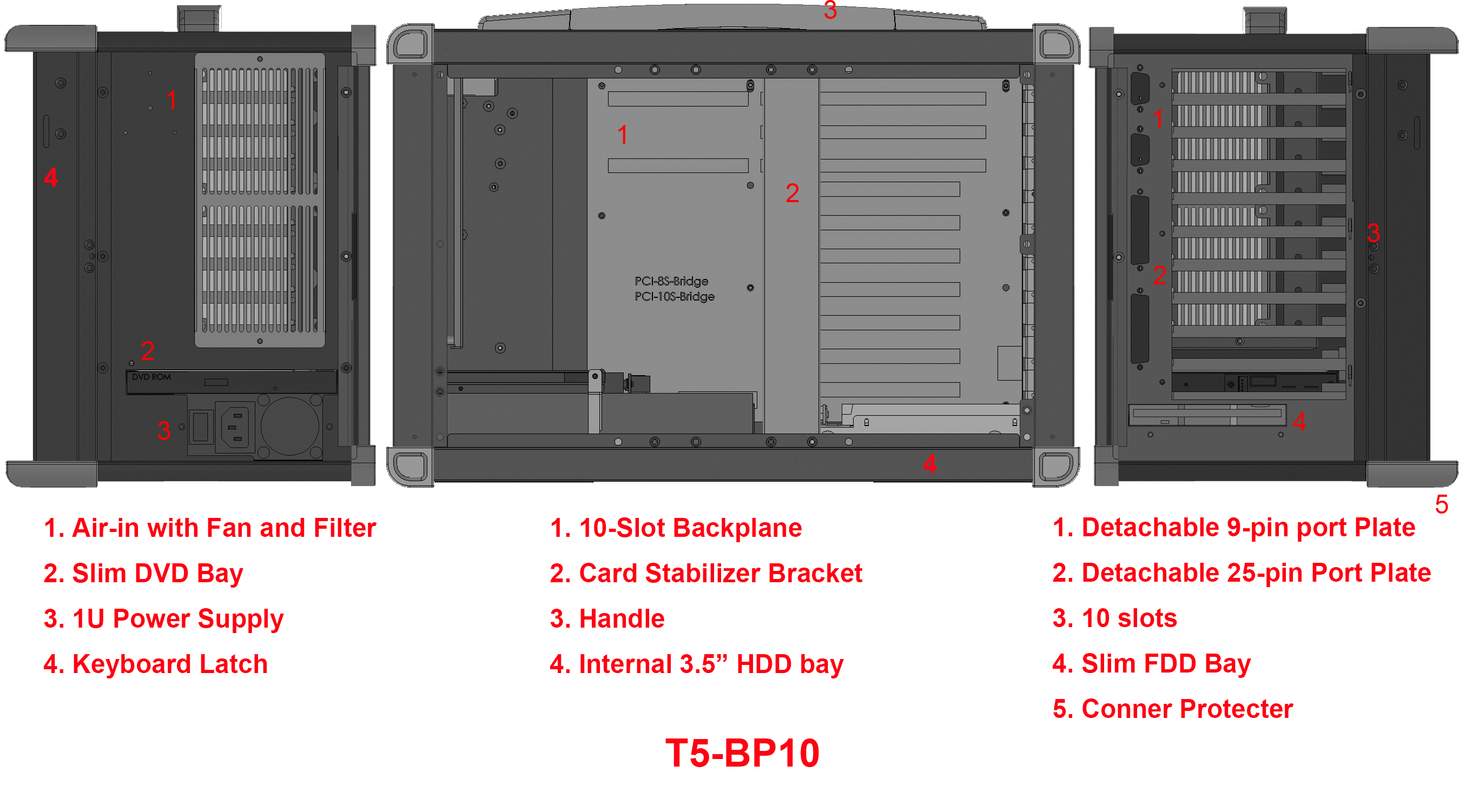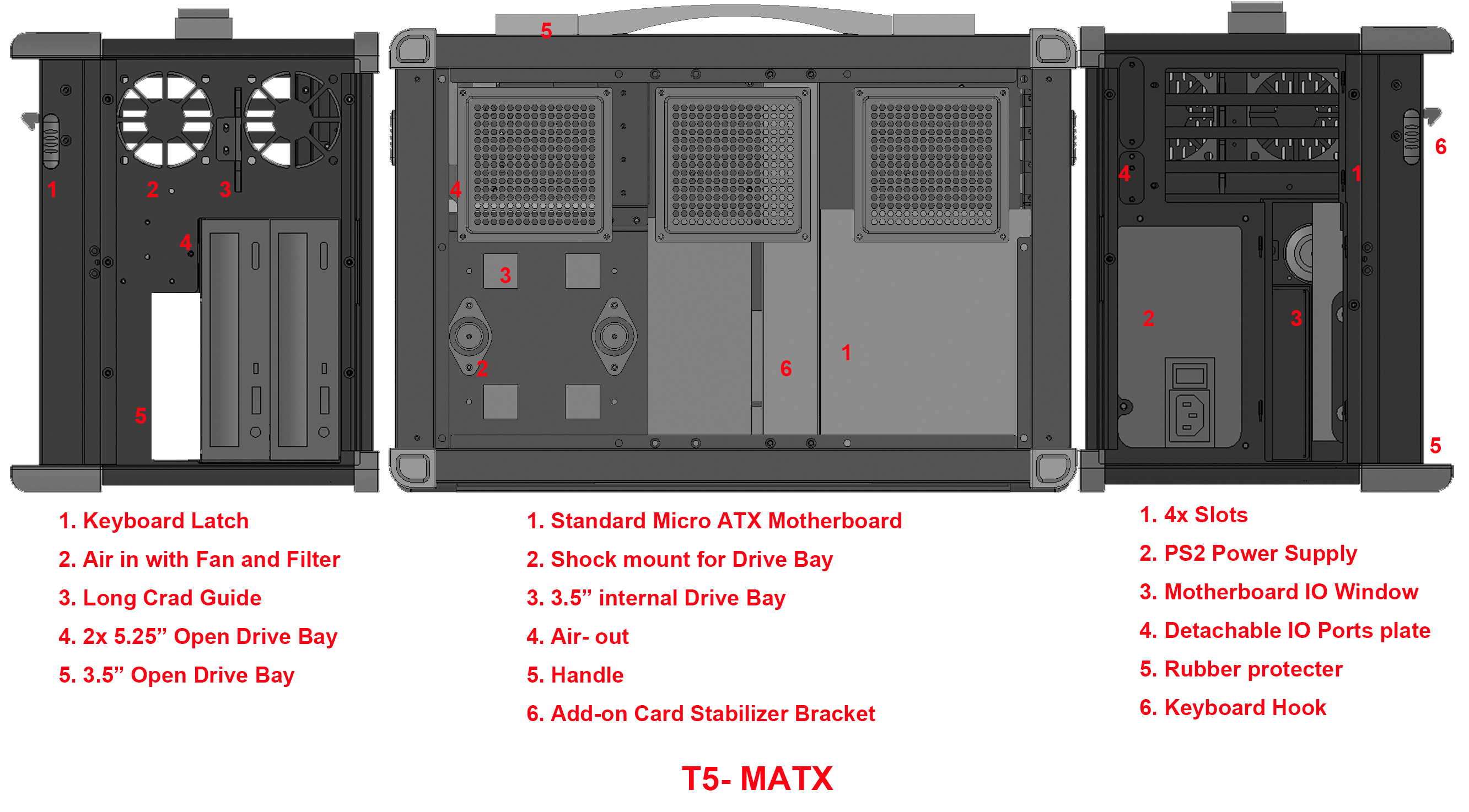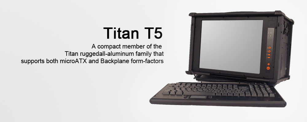 Titan T5是Titan全鋁合金系列中一個較小的可攜式電腦機箱。它設計為堅固、可擴充、可升級和可定制與使用標準現成的組件。T5可用於標準Micro-ATX或工業背板,這兩種型號可支援來自INTEL和AMD的處理器,這可增加產品的生命週期,不會在這個快速變化的行業中過時。