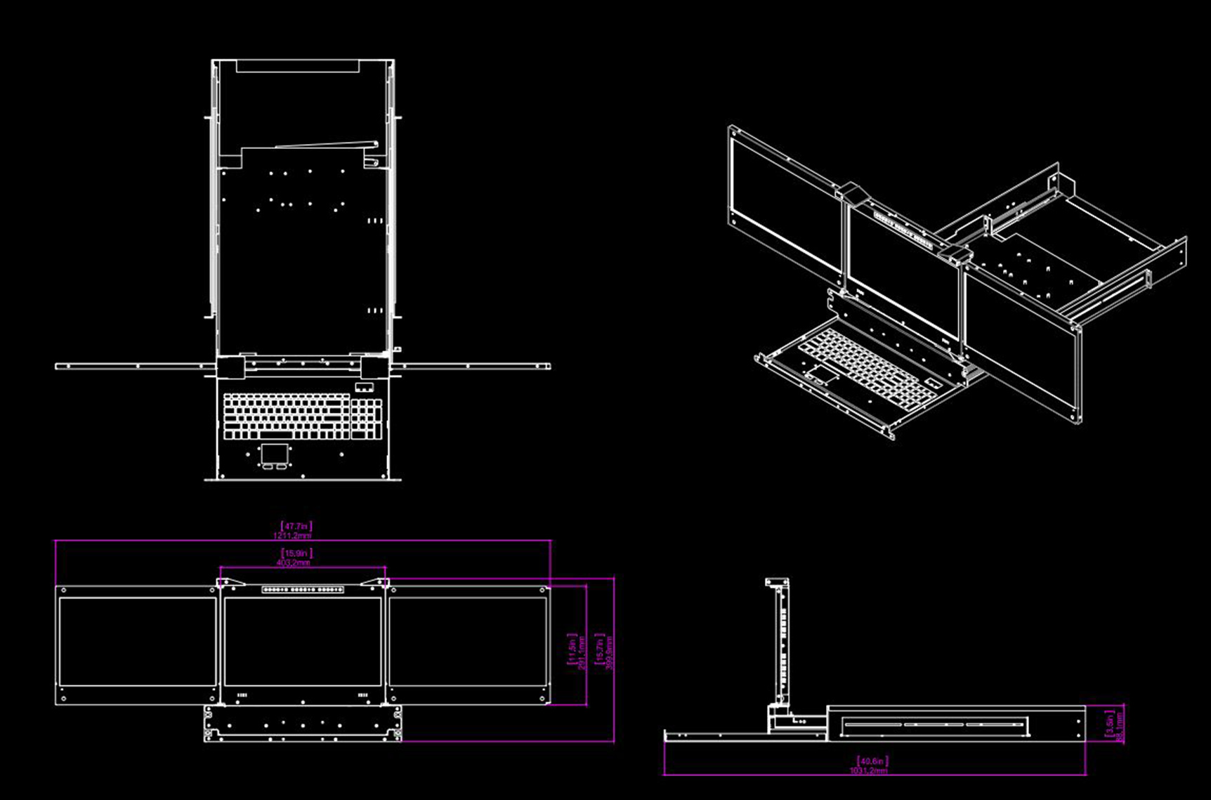 LCD平板顯示器由位於抽屜背面的60W 100-240V全頻電源供電,配有搖臂開關。 鍵盤,觸控板和VGA連接器也位於抽屜背面,方便使用。