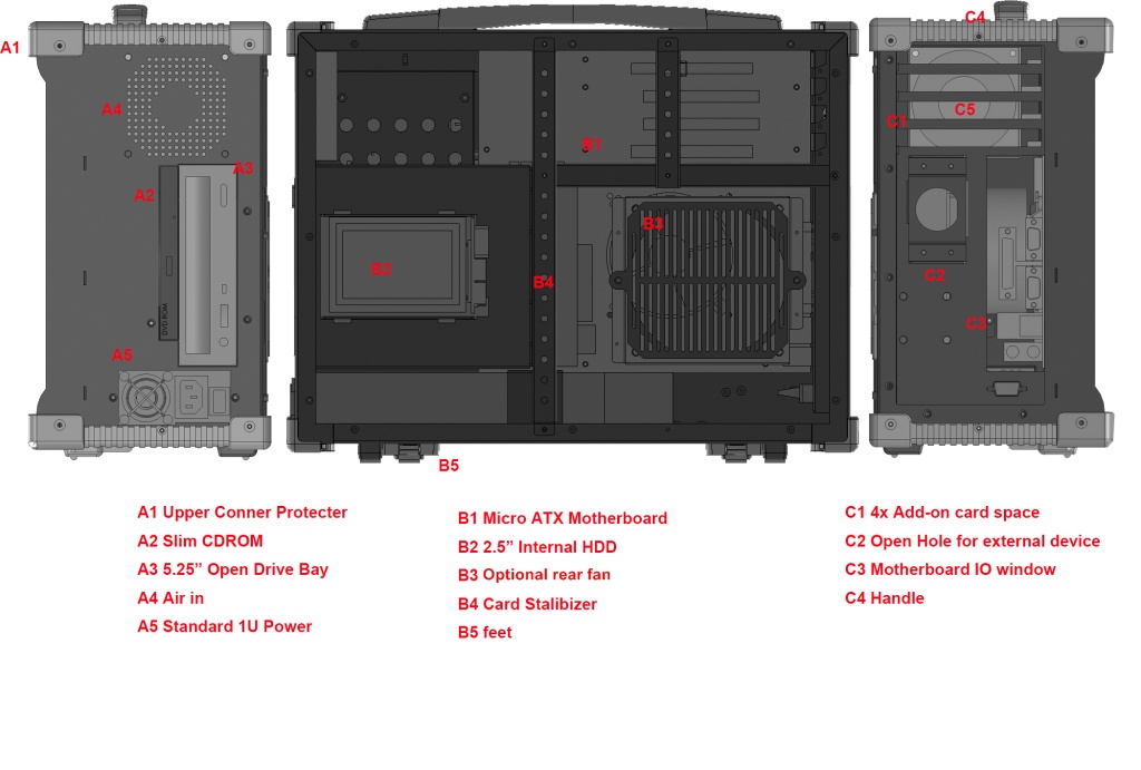 The system’s integrated LCD offers a high-resolution flicker-free visual environment that rivals tradition CRT monitors. The Spark-S5 has the capability to accept a maximum of four expansion cards (motherboard dependent) along with one 2½” Disk Drives, one 5¼” open drive bay and one  slim-type CD-ROM  bay, offering expansion capability unmatched by any other portable system. The all-aluminium Spark-S5 chassis is the ideal solution for applications such as portable servers, network/communications testing, field data acquisition, remote field service, exploration, factory monitoring/automation, new technology demonstration, and much more.